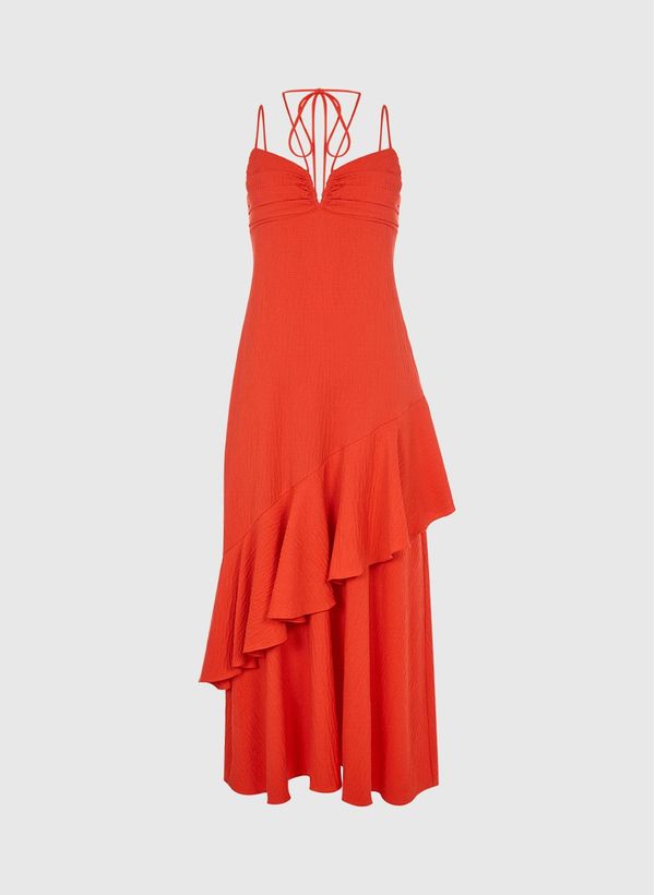 Confeccionado em tecido plano texturizado, o Vestido possui modelagem evasê, decote semi coração com detalhe em V, busto drapeado, alças finas, babado assimétrico sobreposto, fechamento posterior por amarração superior e zíper, comprimento midi e acabamento pespontado.