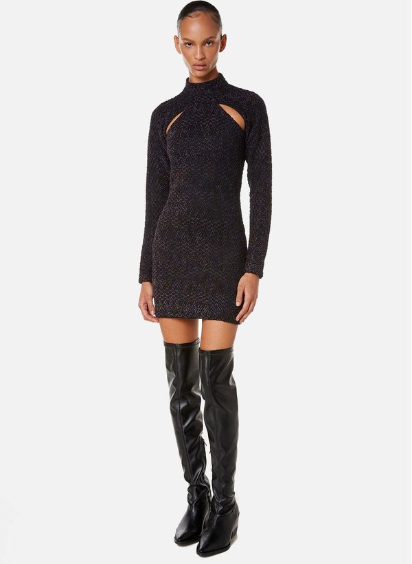 Confeccionado em malha da linha Black, o Vestido possui modelagem justa ao corpo, comprimento curto, gola alta com fecho de botão, mangas longas com recorte na região dos ombros e costas abertas