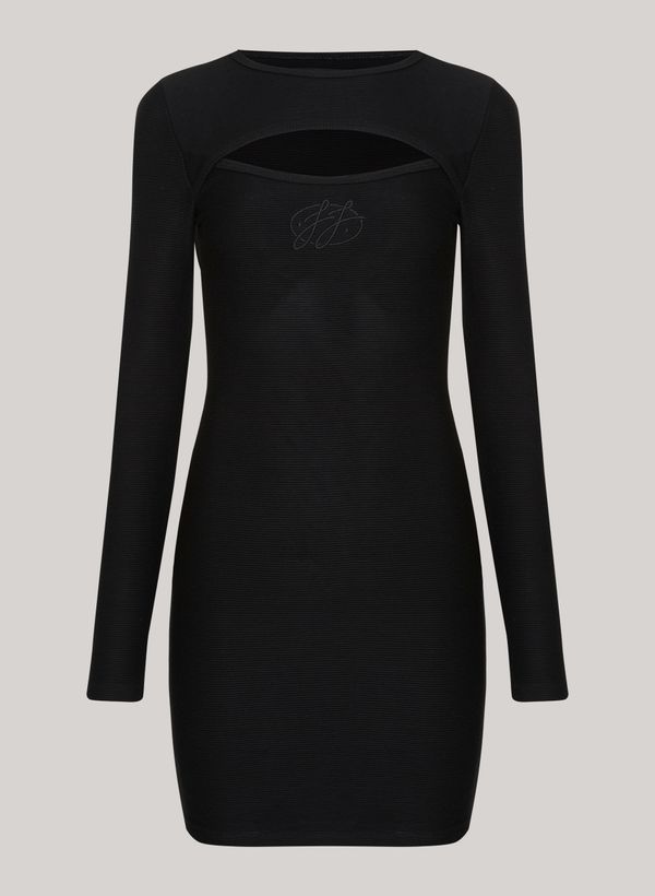 justa, gola redonda, recorte vazado no colo, estampa frontal em bordado, mangas longas, comprimento curto e acabamento canelado.