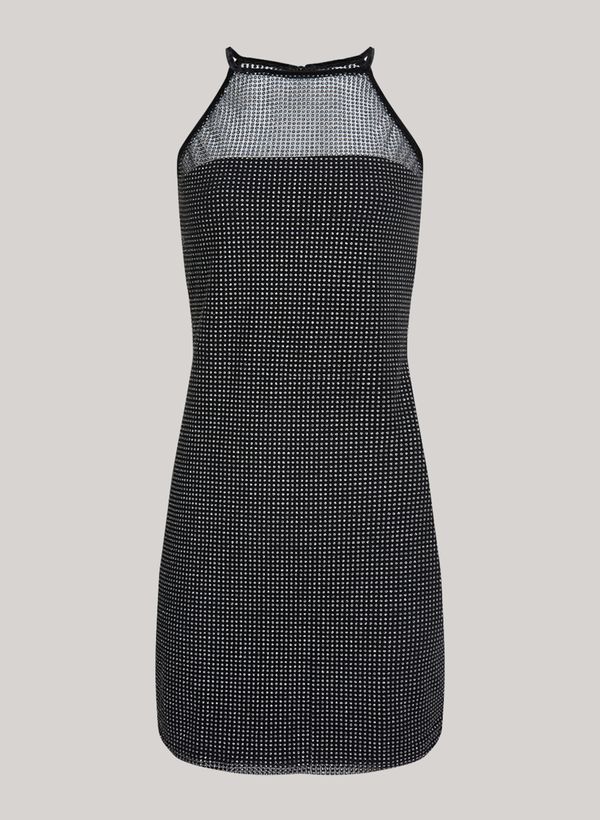 justa, decote reto, alças finas com fechamento posterior no pescoço, strass aplicado por toda a peça, acompanha forro, comprimento curto e acabamento pespontado.