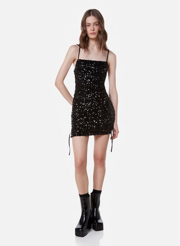 Confeccionado em malha de paetê, o Vestido possui modelagem ajustada ao corpo, comprimento curto, alças finas, decote reto, lateral aberta com detalhe de amarração cruzada e fechamento posterior por zíper metálico.