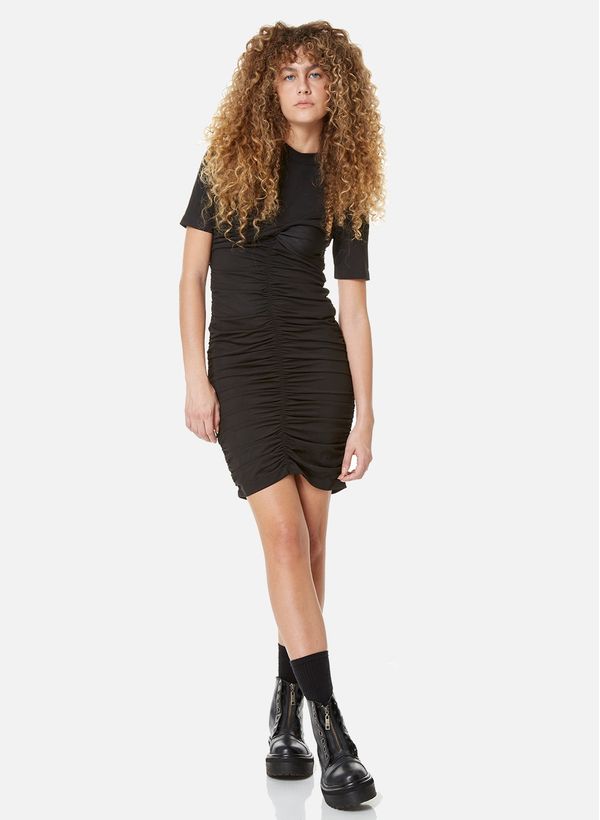 Confeccionado em malha da linha Black, o Vestido possui modelagem ajustada ao corpo, mangas curtas, gola alta, detalhe de torção no busto e franzindo no corpo, fechamento por zíper invisível posterior e acabamento pespontado.