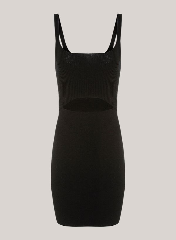 Confeccionado em tricot, o Vestido possui modelagem justa, alças finas, decote reto, recorte abaixo do busto, comprimento curto, plaquinha metalizada com logo da marca e acabamento canelado.