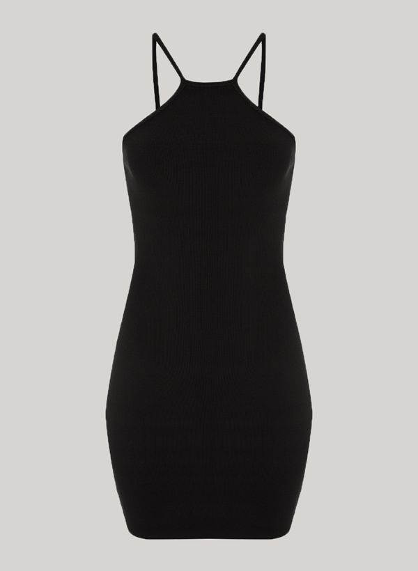 Confeccionado em tricot, o vestido possui modelagem justa, alças finas, recorte posterior, plaquinha metalizada com logo da marca, comprimento curto e acabamento canelado.