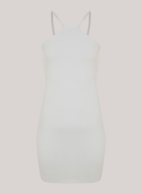 Confeccionado em tricot, o vestido possui modelagem justa, alças finas, recorte posterior, plaquinha metalizada com logo da marca, comprimento curto e acabamento canelado.