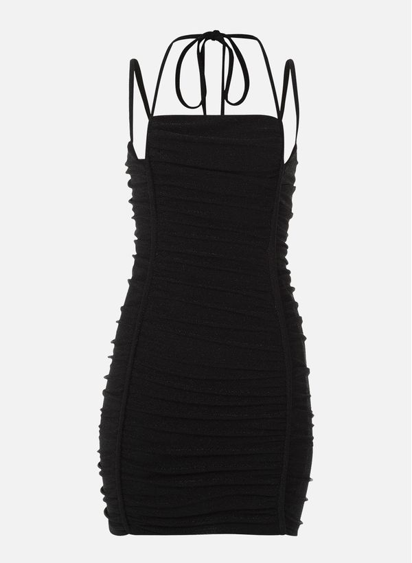 Confeccionado em malha com lurex, o Vestido possui modelagem ajustada ao corpo, detalhe de franzido por todo o comprimento, alça dupla e fechamento por zíper invisível posterior.
