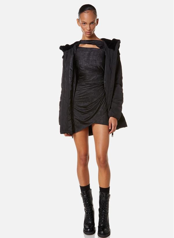 Confeccionado em malha Black, o Vestido possui modelagem justa com mangas longas, decote irregular com recorte transversal frontal e horizontal posterior, detalhe de drapeado lateral e acabamento pespontado.