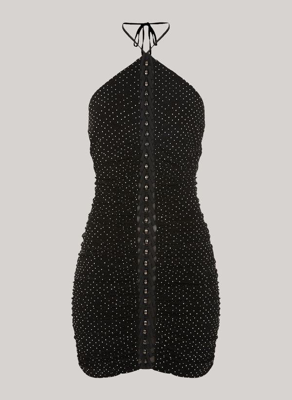 Confeccionado em malha black, o vestido possui modelagem justa, decote frente única, detalhe frontal em franzido, aplicação de Hot Fix , fechamento posterior por zíper e acabamento pespontado.