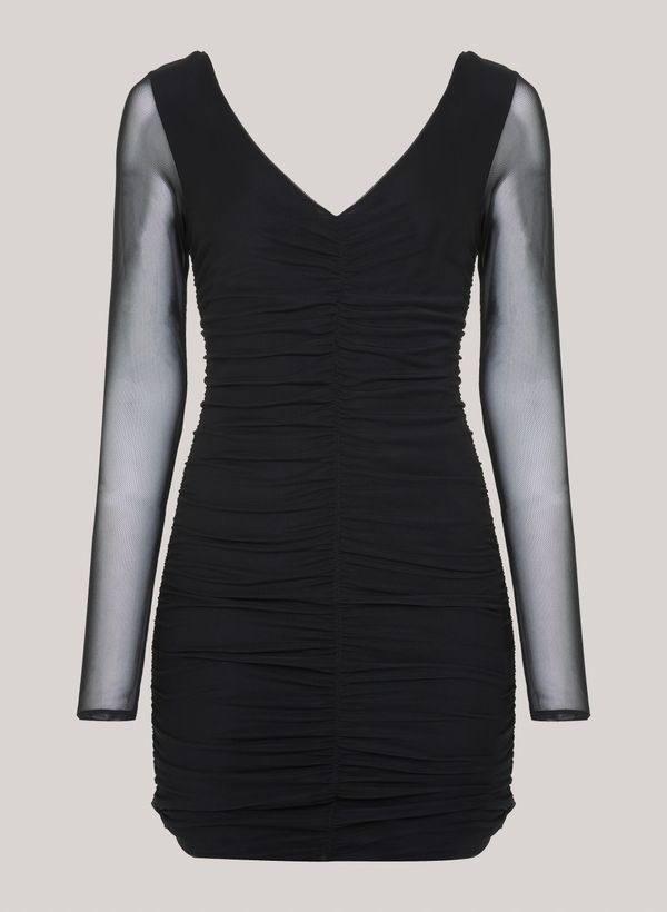 Confeccionada em malha e tule, o vestido possui modelagem justa, pregas laterais e frontais aplicadas que conferem um enrugamento na malha, decote em V, mangas longas com transparência e comprimento curto.