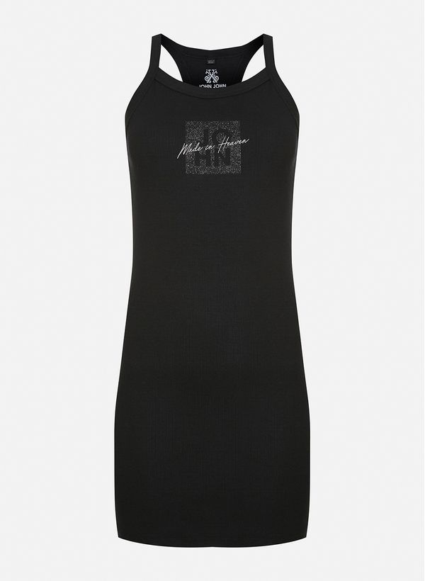 Confeccionado em malha, o vestido possui modelagem justa, decote nadador, alças finas, estampa frontal com brilho, comprimento curto e acabamento canelado.