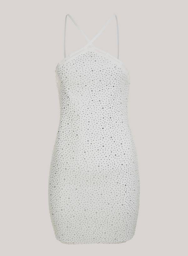 Confeccionado em tricot com aplicações de brilho, o Vestido possui modelagem justa ao corpo, alças finas cruzadas, plaquinha metalizada com logo da marca posterior e acabamento canelado.