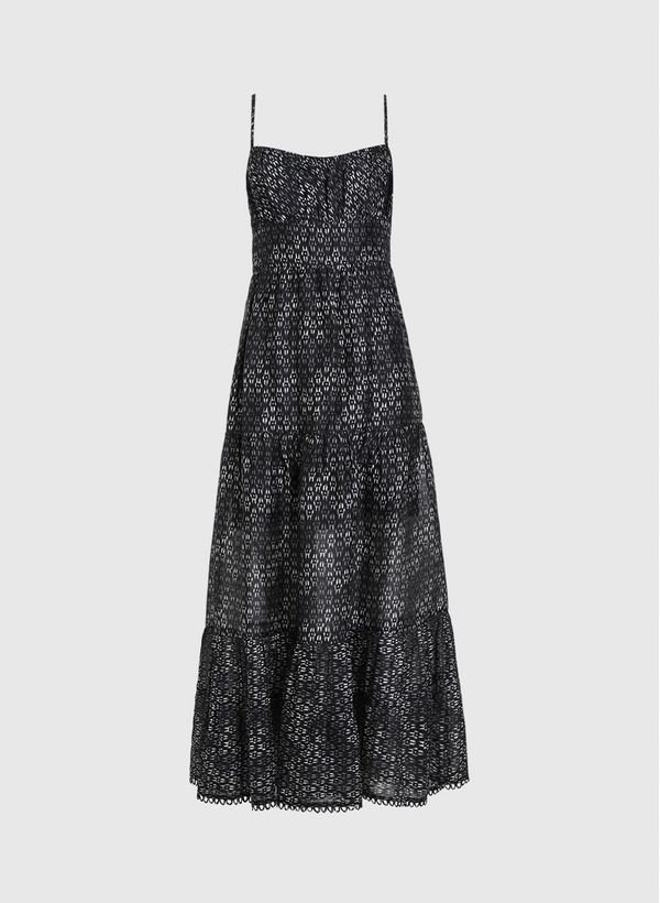 Confeccionado em tecido plano estampado com toque de linho e seda, o Vestido possui modelagem evasê, decote reto com detalhes de pregas, alças finas trançadas, fechamento lateral por zíper invisível, comprimento longo com detalhes franzidos, barra com babados, forro embutido e acabamento pespontado.