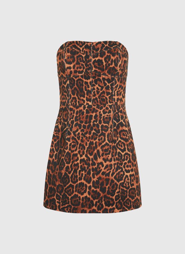 O Vestido é confeccionado em malha, possui estampa animal print, decote off shoulder, modelagem evasê, fechamento posterior por zíper invisível, comprimento curto e acabamento pespontado.