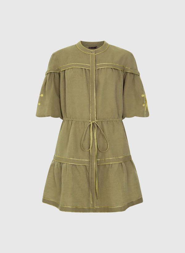 O Vestido é confeccionado em linho com toque de algodão, possui bordado localizado com efeito brilhante, modelagem evasê, gola redonda, mangas curtas bufantes, cordão para amarração, fechamento frontal por botões e vista sobreposta, comprimento curto e acabamento pespontado.