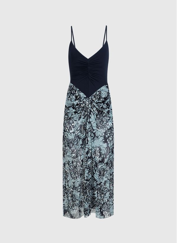 O Vestido é confeccionado em georgette de viscose, possui modelagem reta, caimento acinturado, alças finas, decote em "V", detalhe frontal de franzidos, fechamento posterior por zíper invisível e body interno, comprimento midi e acabamento pespontado.
