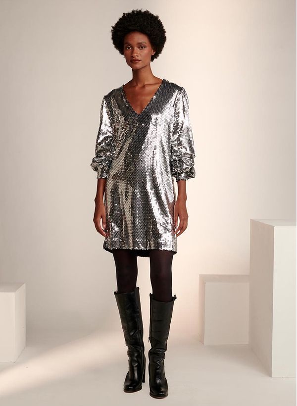 Brilhante, o Vestido Alexia eleva a produção por conta dos paetês, deixando seu look festivo e trendychic. Aposte na combinação com acessórios, meia fina e botas pretas de cano longo, para um visual cool e infalível para eventos celebrativos.