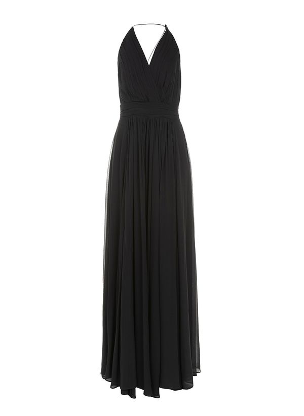 O Vestido é confeccionado em seda, possui modelagem evasê, detalhes drapeados, caimento acinturado, alças finas com detalhe posterior assimétrico, decote V transpassado, recorte na cintura, fechamento lateral por zíper invisível, forro embutido e comprimento longo levemente plissado.