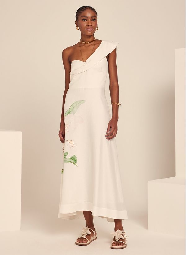 O Vestido é confeccionado em tecido plano com toque de linho, possui estampa, modelagem evasê, decote um ombro só, fechamento posterior por zíper invisível, comprimento midi e acabamento pespontado.