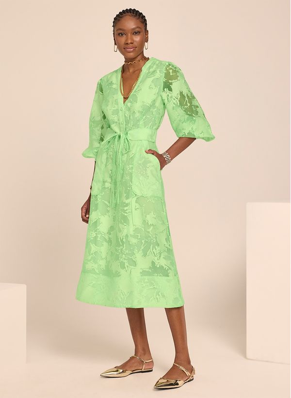O Vestido é confeccionado em tecido plano, possui modelagem evasê, decote "V", mangas longas bufantes com abotoamento nos punhos, faixa removível para amarração, comprimento midi e acabamento pespontado.