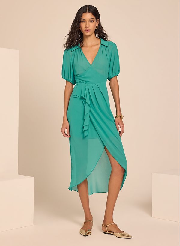 O Vestido é confeccionado em tecido fluido, possui transparência, caimento acinturado, decote em “V” transpassado, colarinho, mangas curtas bufantes, detalhe de pregas e babados na cintura, forro embutido, comprimento midi e acabamento pespontado.