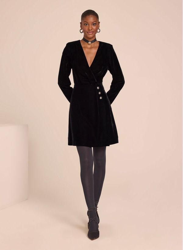 O Vestido é confeccionado em tecido plano aveludado, possui caimento reto, decote em "V" transpassado, mangas longas, botões, comprimento curto e acabamento pespontado.