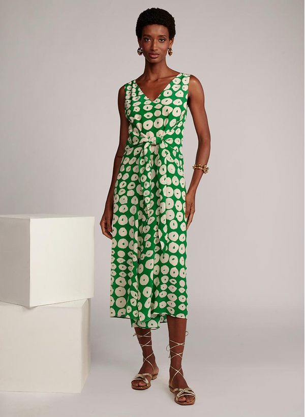 O Vestido é confeccionado em seda, possui padronagem, caimento acinturado, gola em V, alças médias, cintura com faixa para amarração, fechamento posterior por zíper, comprimento midi e acabamento pespontado. A peça acompanha faixa para amarração do mesmo tecido.