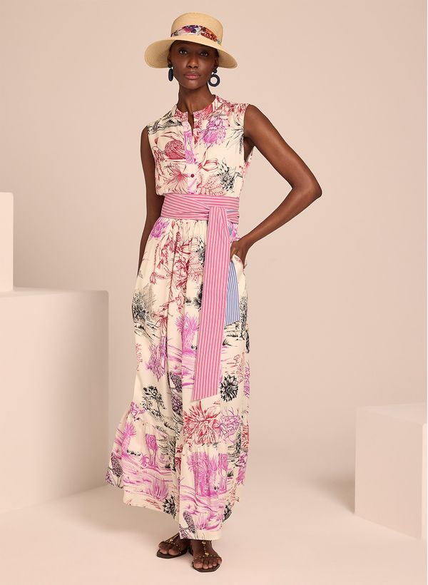 O Vestido é confeccionado em viscose, possui estampa floral, modelagem evasê, caimento acinturado, alças largas, gola redonda, fechamento frontal por botões, bolsos laterais modelo faca, comprimento longo e acabamento pespontado.