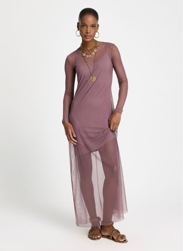 O Vestido é confeccionado em malha telada com transparência, possui caimento reto, gola redonda, mangas longas, forro embutido curto e barra a fio.