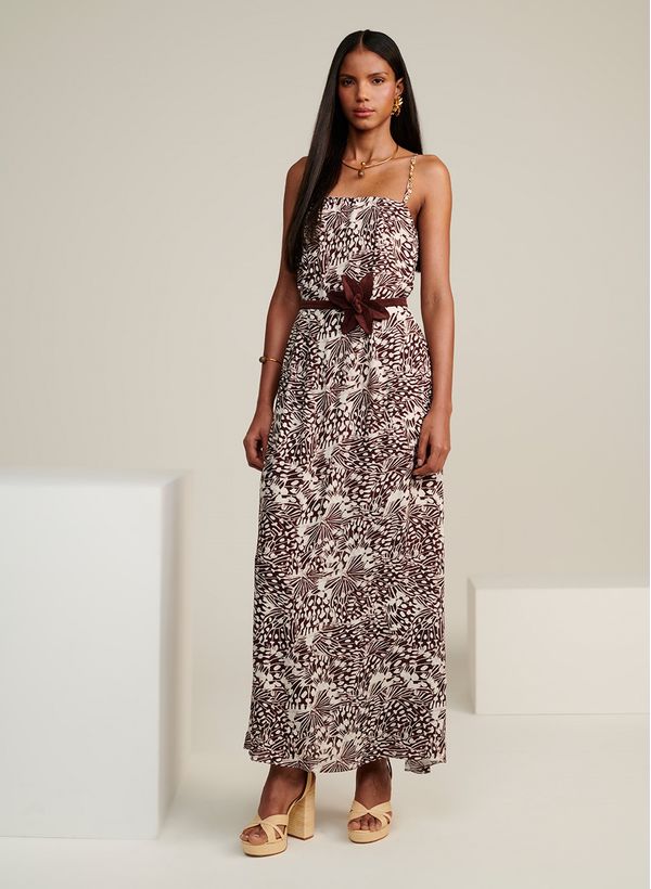 O Vestido é confeccionado em tecido fluido estampado, possui modelagem levemente evasê, decote reto, alças finas com detalhe metálico, faixa aplicada na cintura com detalhe metálico, fechamento posterior, forro embutido, comprimento midi e acabamento pespontado.A peça acompanha faixa do mesmo tecido.