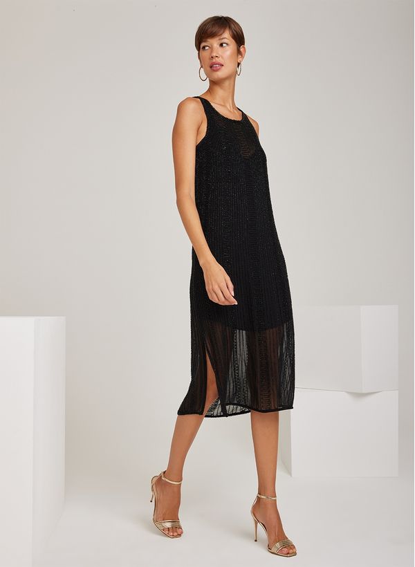 O Vestido é confeccionado em tecido fluido com bordado de pedrarias, possui leve transparência, caimento reto, decote em U, alças médias, fenda lateral, forro interno e comprimento midi.