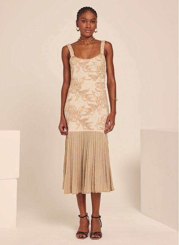 O Vestido é confeccionado em tricot com detalhes florais em alto relevo, possui caimento ajustado, alças médias trançadas, decote em "U", comprimento midi com plissados e acabamento canelado.