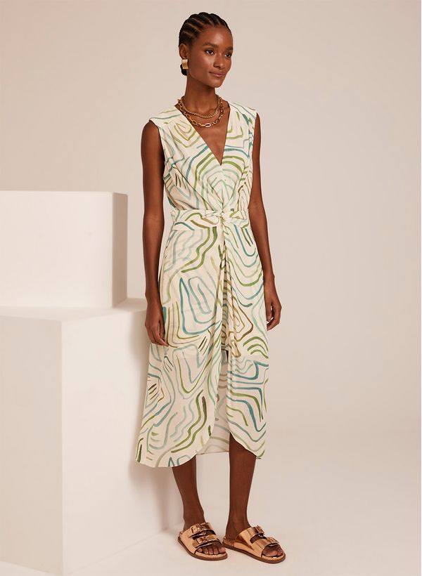 O Vestido é confeccionado em tecido fluido com estampa, possui decote V, alças largas, faixa aplicada, fenda frontal, comprimento midi e acabamento pespontado.