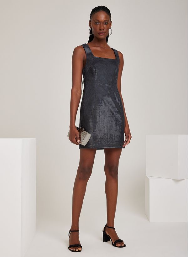 O Vestido é confeccionado em malha com efeito metalizado, possui decote reto, alças médias, comprimento curto e acabamento pespontado.