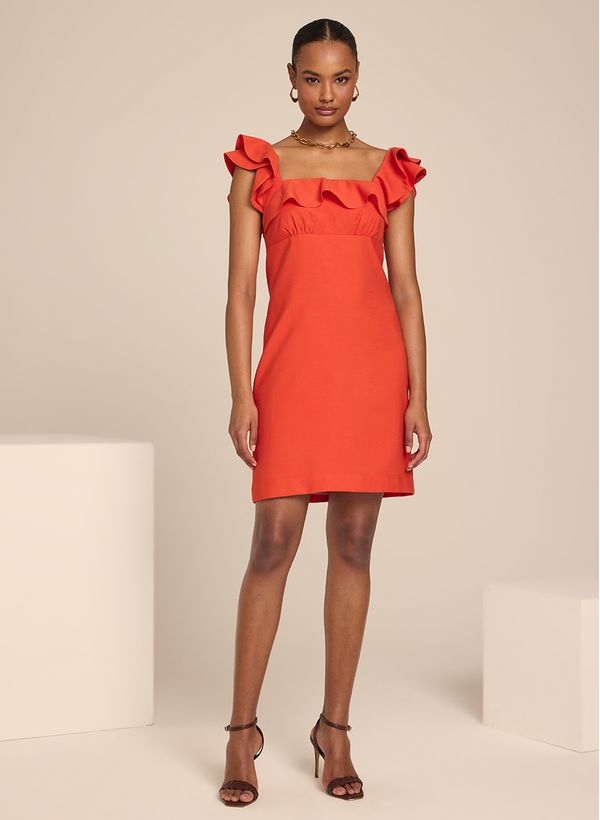 O Vestido é confeccionado em tecido plano, possui caimento reto, decote reto com babados, alças médias, fechamento posterior por zíper, comprimento curto e acabamento pespontado.