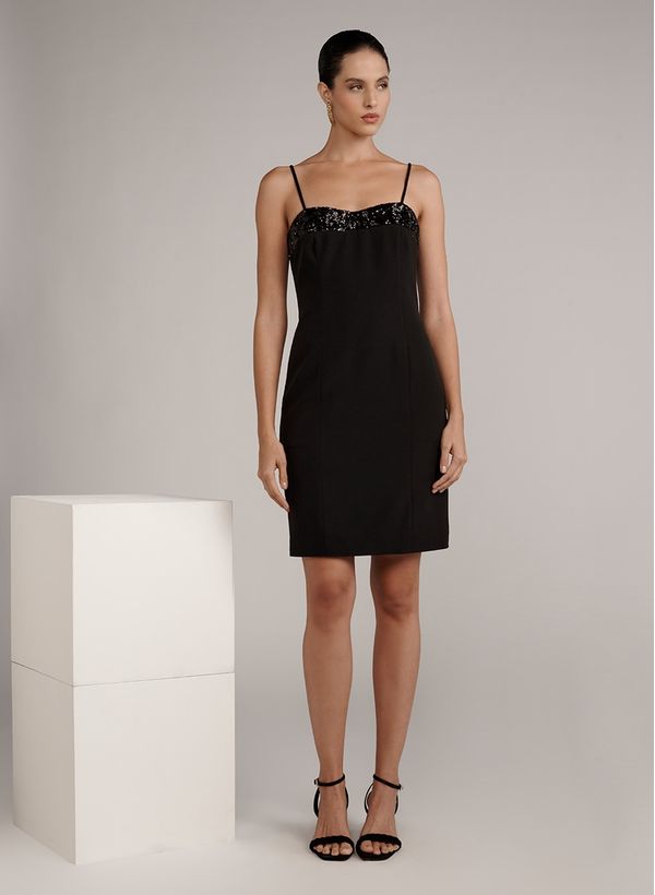Confeccionado em tecido plano com modelagem alfaiataria, o Vestido possui caimento acinturado, decote coração com bordado de paetês, alças finas, bolsos laterais, fechamento posterior por zíper invisível e comprimento curto.