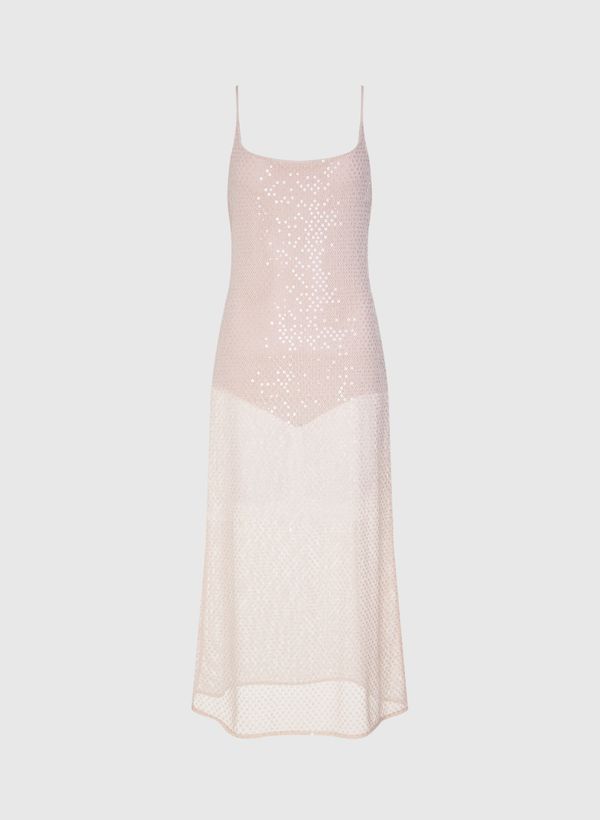 Confeccionado em malha tule bordada com paetês, o Vestido possui caimento reto, leve transparência, alças finas, decote semi "U", body interno, comprimento midi e acabamento pespontado.