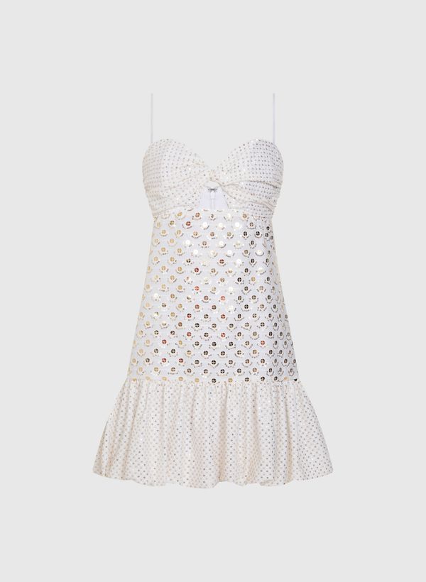 O Vestido é confeccionado em tecido plano com paetês bordados, possui caimento acinturado, alças finas, decote coração, busto com detalhe torcido e recorte frontal, fechamento posterior por zíper invisível, barra aplicada com efeito balonê, forro interno, comprimento curto e acabamento pespontado.