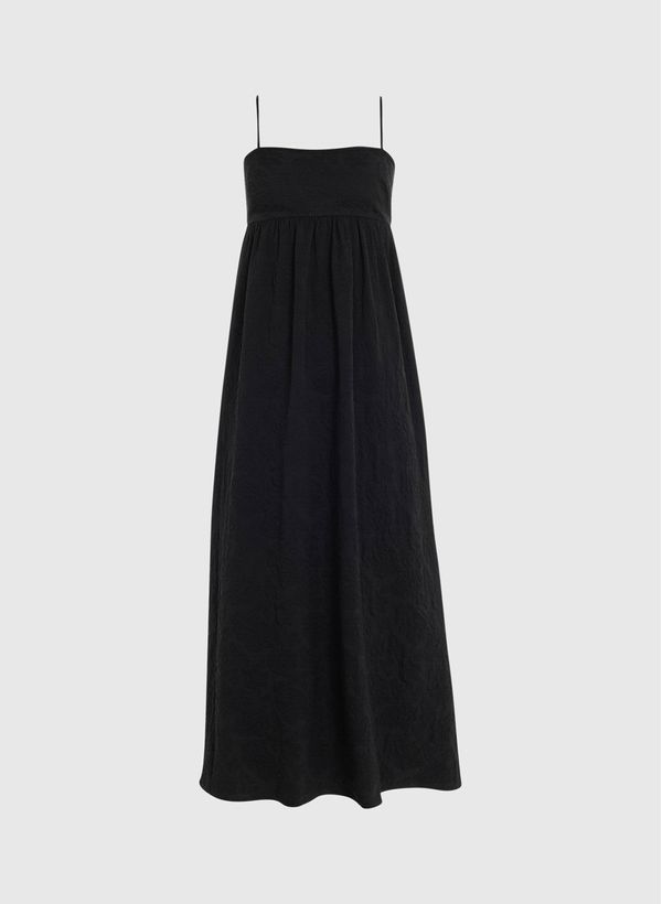 Confeccionado em tecido plano, o Vestido possui padronagem floral monocromática em alto relevo, decote reto, alças finas, modelagem evasê, comprimento midi e acabamento pespontado.