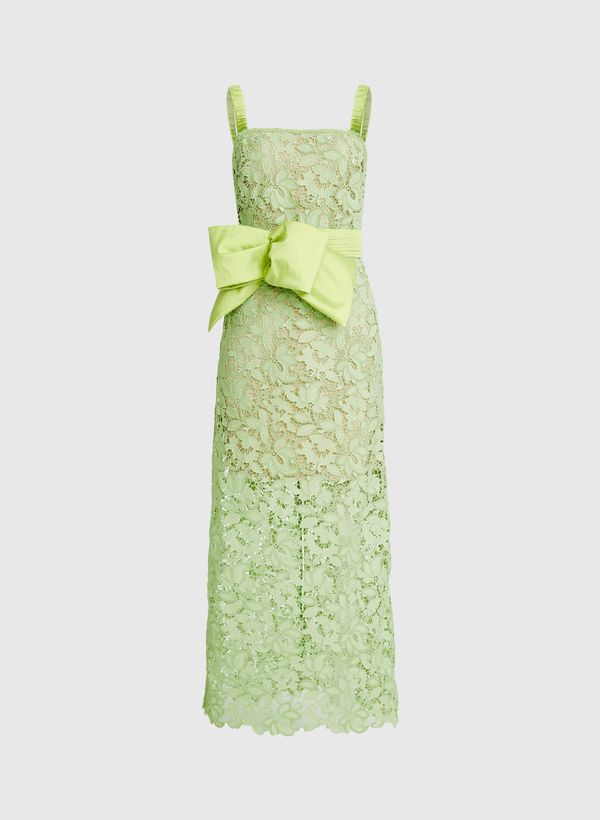 O Vestido é confeccionado em renda bordada, possui transparência, decote reto, alças finas, forro interno, fechamento posterior por zíper invisível, comprimento midi e acabamento do barrado do próprio tecido.