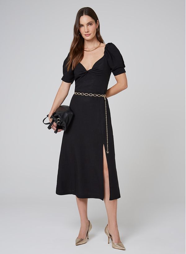 O Vestido com Mangas Bufantes transmite um visual impactante e cheio de estilo. Combine o Vestido com sapatos de salto alto e uma clutch elegante. Adicione joias delicadas, como brincos e um colar fino, para completar o look com toque de sofisticação.