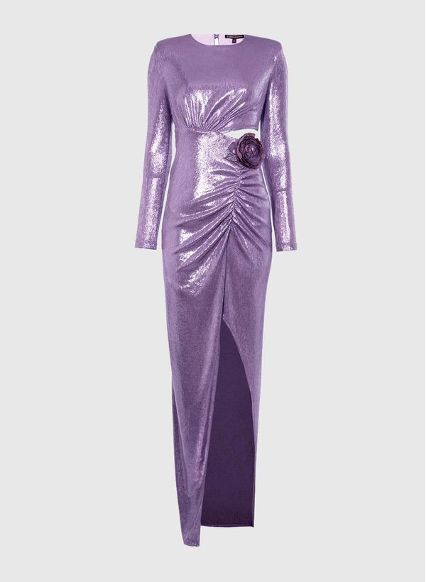 Confeccionado em malha, o Vestido caimento justo, mangas longas, decote redondo, recorte vazado na cintura, detalhe franzido frontal com fenda, barra assimétrica, broche removível, comprimento longo e acabamento pespontado.