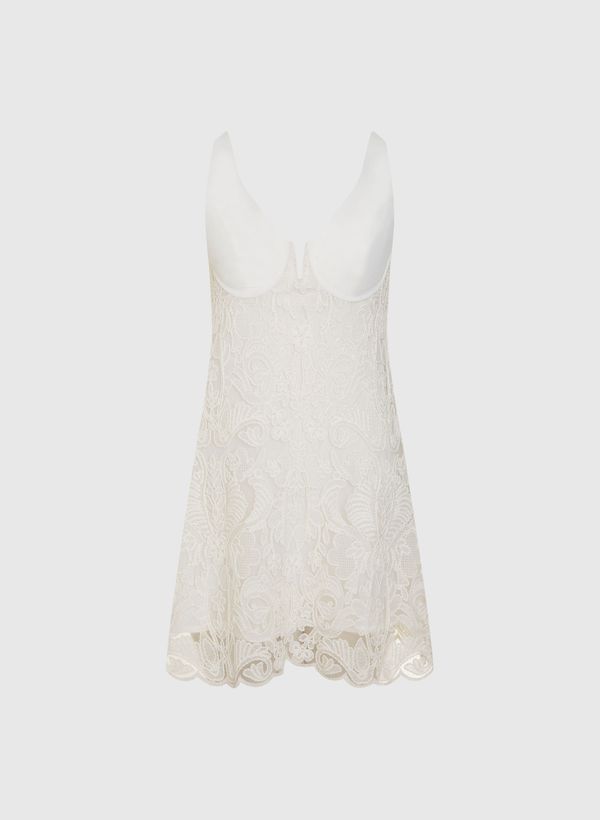O Vestido é confeccionado em tule bordado com detalhe em crepe, possui caimento reto, alças médias, decote em "V" com detalhe vazado, fechamento posterior por zíper invisível, barra ondulada, forro interno, comprimento curto e acabamento pespontado.