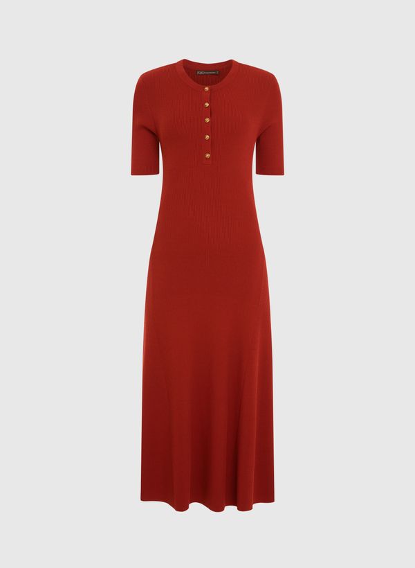 O Vestido é confeccionado em tricot, possui caimento reto, gola redonda, mangas curtas, fechamento frontal por botões, comprimento midi e acabamento canelado.