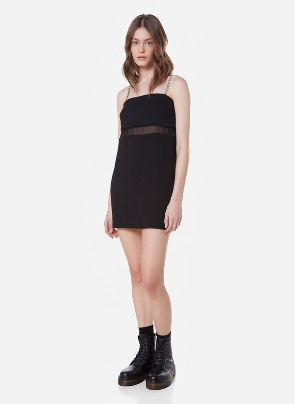 Confeccionado em tecido plano, o Vestido possui modelagem mais reta ao corpo, comprimento curto, alças em corrente, decote reto, transparência na cintura e fechamento por zíper de metal com puxador personalizado da marca.
